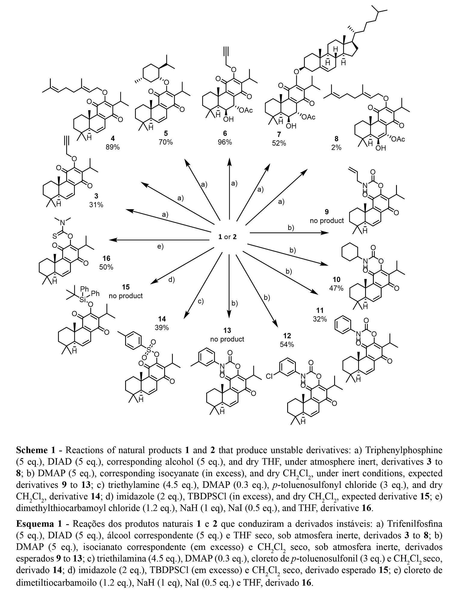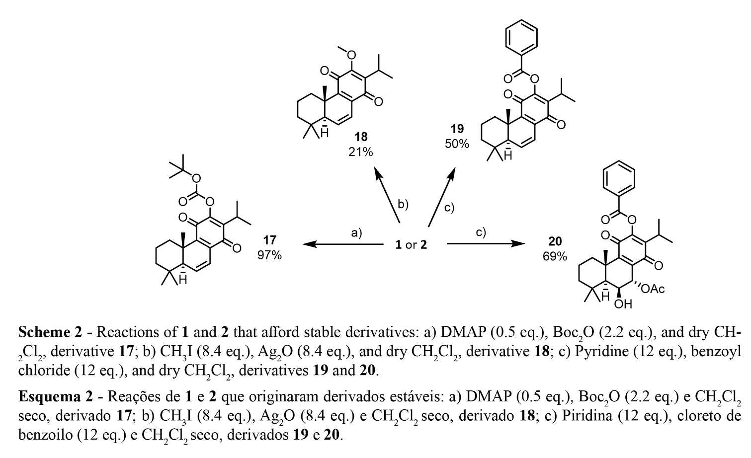 The reactivity of two natural royleanones 1 and 2 was explored. Several hemi-synthetic reactions were performed, and the obtained products were limited by stability issues: the derivatives 3 to 16 tend to degrade after isolation. Successful results were obtained when performing methylation and benzoylation, as with the introduction of a BOC group, affording pure compounds (17 to 20), with overall good yields.