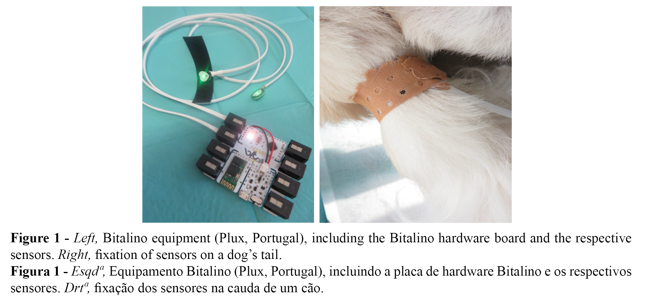 For each dog, we performed a trichotomy of a small area in the ventral part of the tail in order to improve the contact between the sensor and the skin (Figure 1); the choice of the tail as study site was due to ease of access and comfort for the animal. Data collection was carried out for 3 to 5 minutes followed by preanesthetic medication using 0.35 mg/kg methadone (Semfortan, Esteve, Spain) and 5 µg/kg dexmedetomidine (Dextomitor, Zoetis, USA) by intramuscular injection. After a waiting period of between 15 and 30 minutes to ensure the expected (sedative) effect of the medication, the PPG signal was collected again in the same anatomical region. The data was obtained with a PPG sensor connected to a Bitalino hardware (Plux, Portugal) (Figure 1), and later downloaded to the OpenSignals (r)evolution software (beta version v.2015) of Bitalino. Finally, data was analyzed using the MatLab software (MathWorks Inc, v. R2016a, USA) after selecting the column of obtained values and following the visualization of the corresponding pulse wave (Figures 2 and 3).