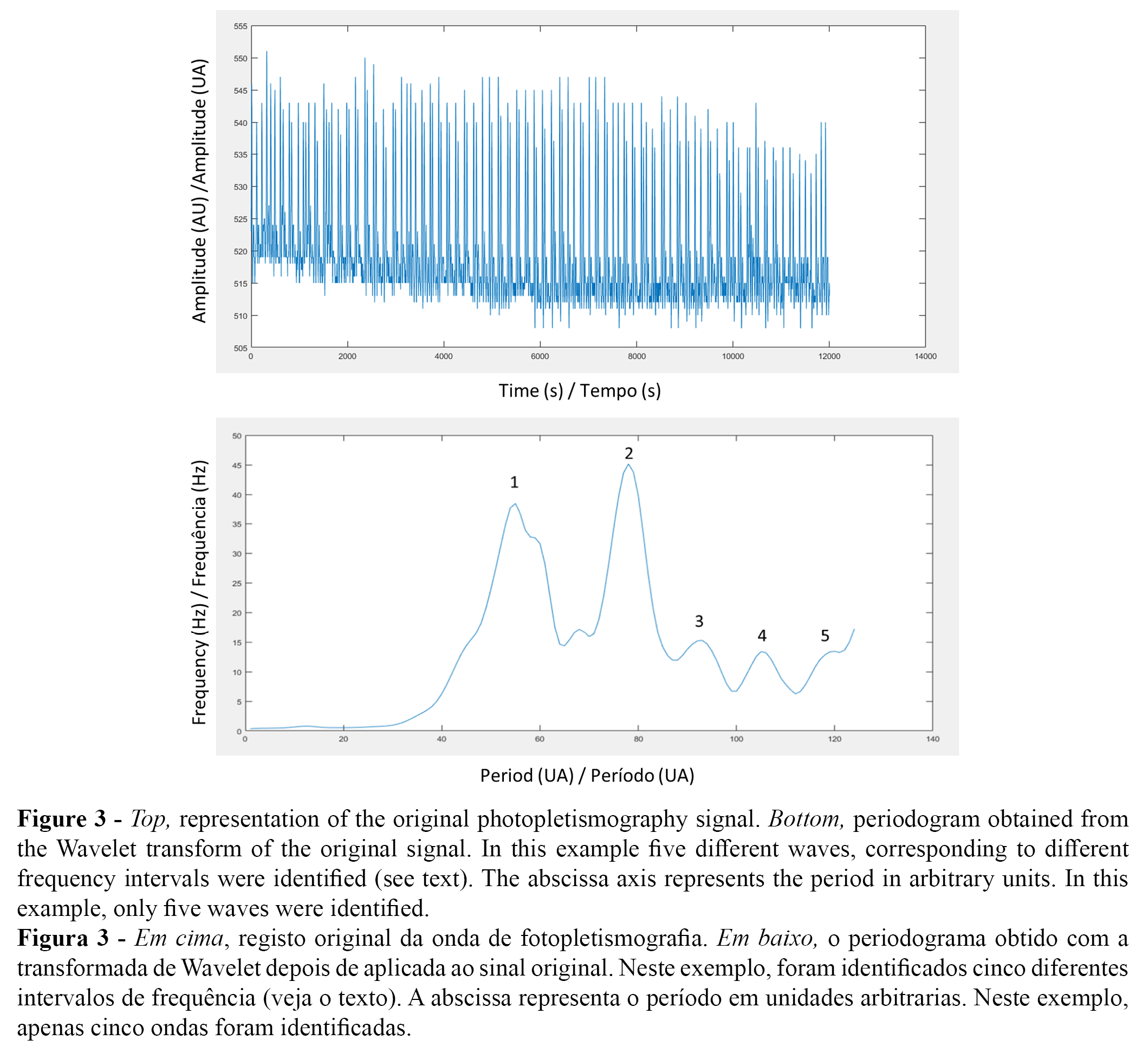 Photoplethysmography (PPG) is a non-invasive technique (2) with a wide range of clinical applications, being used in several devices, such as pulse oximeters and blood pressure detection systems (3). The PPG signal reflects changes in blood volume in the cutaneous and subcutaneous vascular plexus (3,4), having a major component associated with heartbeat and respiration and others associated with low frequency influencers (5). Using signal analysis programs, it is possible to investigate the PPG signal and characterize its various constituents at the different frequencies of the PPG signal (3). In this way, the fluctuations associated with the cardiovascular, respiratory, and neuronal systems can be properly characterized and measured within the PPG signal (6). In 2013, Nilsson described the various frequencies found in PPG signals in humans, using the wavelet method to decompose a primary signal into its various elements (7).