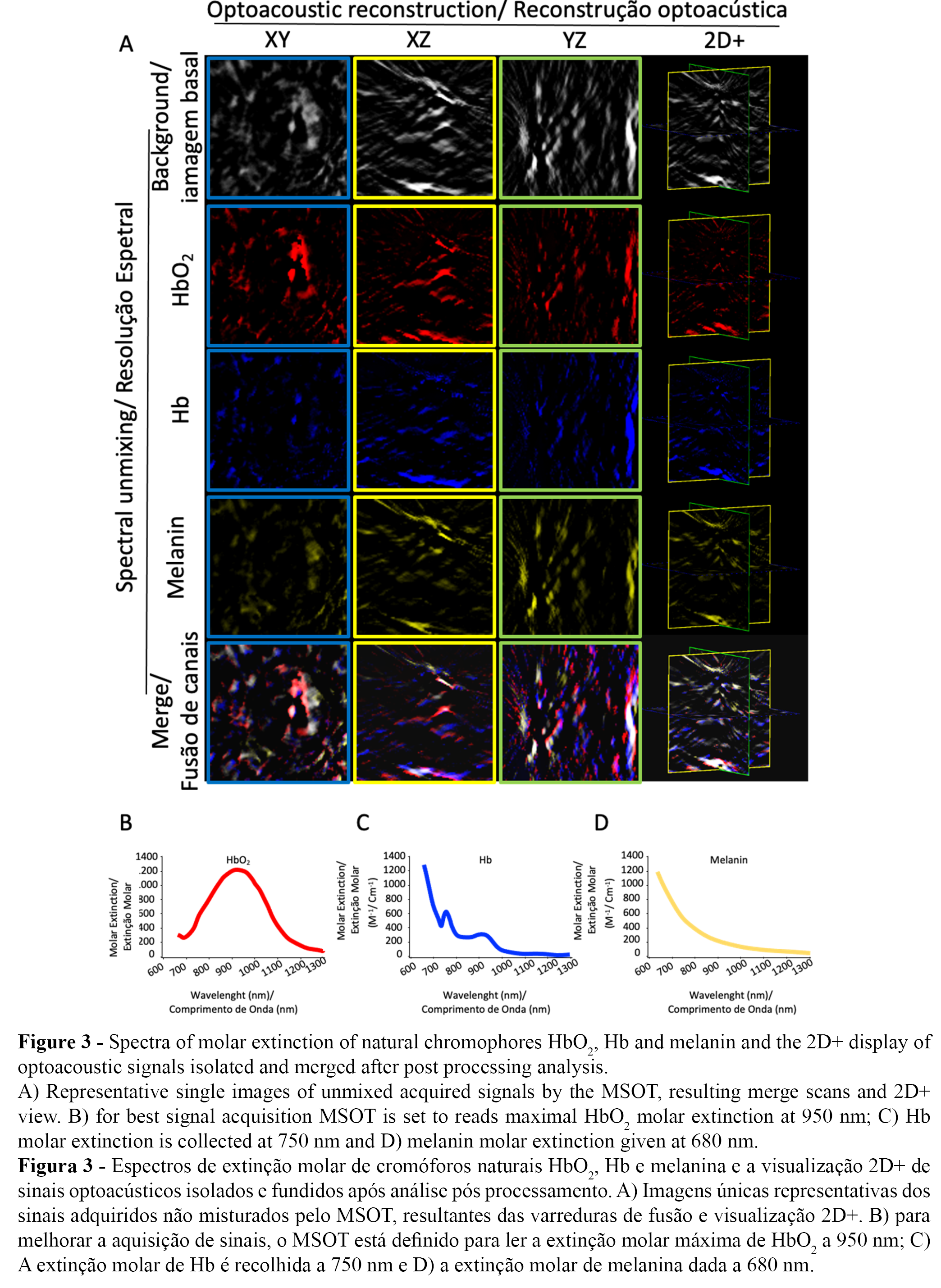 Objects generated during acquisition are three dimensional (3D), and the screenshot view allows measurements and annotations as shown in Figure 2B. To extract data from acquired images, prior analysis requires assembly of multiple thermoelastic signals and post processing by the iThera MSOTview software. This process follows a reconstruction sequence of optoacoustic signals - the correction of the speed of sound for calibration of best focus, application of fluence correction, and calculation of spectral unmixing for the acquired signals of HbO2, Hb and melanin (Figure 3A). For best signal acquisition, the MSOT reads maximal HbO2 molar extinction at 950 nm, Hb at 750nm, and melanin at 680nm (Figure 3B-D). Representative images of each of the acquired signals of HbO2, Hb, and melanin demonstrate the perfect unmixing of the acquired signals in all XY, XZ, and YZ axes and the plot of the respective merged image (Figure 3A). Additionally, a 2D+ image view is generated for optimal navigation over the 3D images acquired and to adjust proper colour intensities. Single chromophore images are fundamental to set correct colour lookup tables and to enable independent study of the acquired signals.