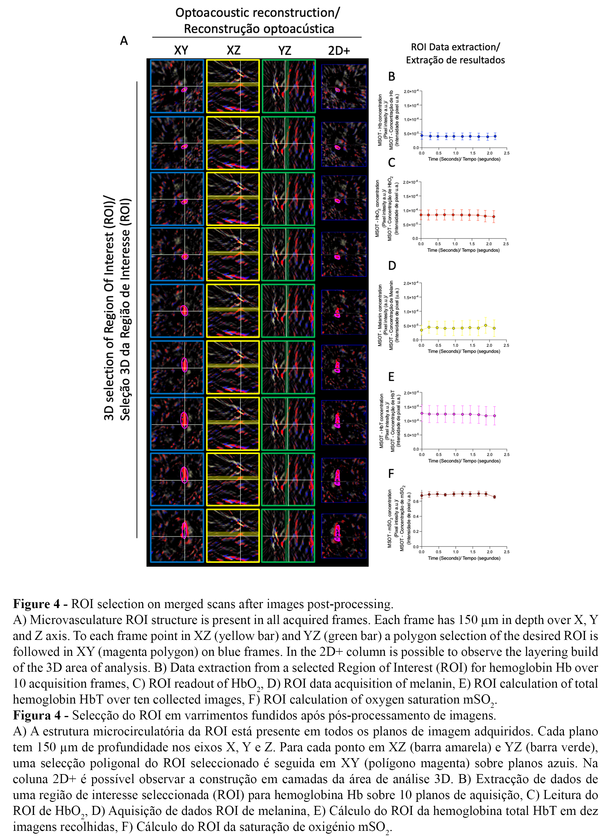 After image reconstruction, fluence correction, focusing of speed of sound, unmixing, and adjustment of color balance and saturation of preferred lookup tables, each chromophore signal acquired by the MSOT can be analysed. To overcome signal flattening from signal-to-noise ratio derived from large image analysis, elements of each 3D scan must be selected as Regions-Of-Interest (ROI) before data analysis. ROI analysis (depicted in Figure 4A) follows a microvasculature ROI structure in 9 of all 10 frames acquired. Each frame is of 150 µm of tissue depth in X, Y and Z axes. To acquire data from any ROI, each frame must follow the selected ROI across XZ (yellow bar in depicted fames) and YZ (green bar in depicted frames) while a polygon selection tool (magenta selected area) delineates the ROI in XY (blue frames). On the 2D+ image overview, the 3D area of analysis is built (Figure 4A).