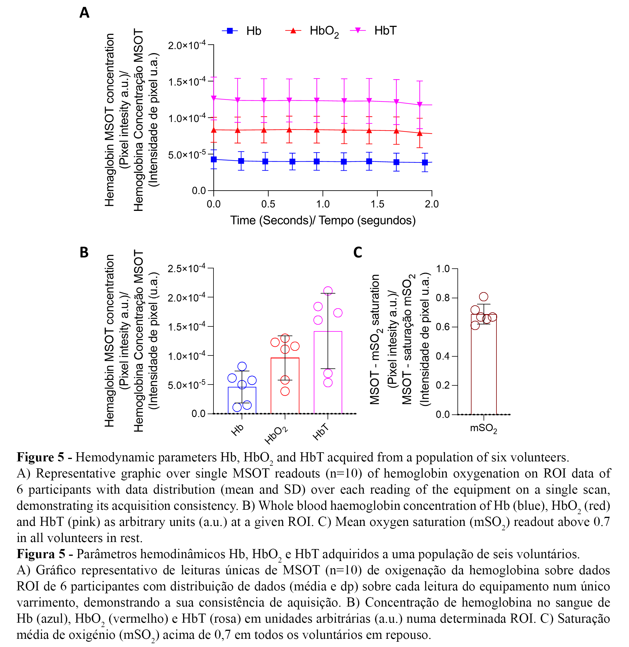 The MSOT calculated HbT (1.23E-04±2.75E-06 a.u) is therefore given by the addition Hb (of 4.00E-05±1.14E-06) and HbO2 (of 8.31E-05±2.21E-06) signal intensities shown in Table 2. Data evaluation plotted in Figure 5A summarizes the scans taken from our six volunteers over a total of ten optoacoustic images in 2s. Data from Hb (line in blue) and HbO2 (line in red) consistently match consistently their addition as HbT (line in pink) over the course of the optoacoustic acquisitions. We also observe that in resting position, HbO2 concentration is statistically higher than Hb in all volunteers (Figure 5B), and that value of mSO2 is consistently above the 0.7 a.u. oxygen saturation signal input cut-off (Figure 5C).