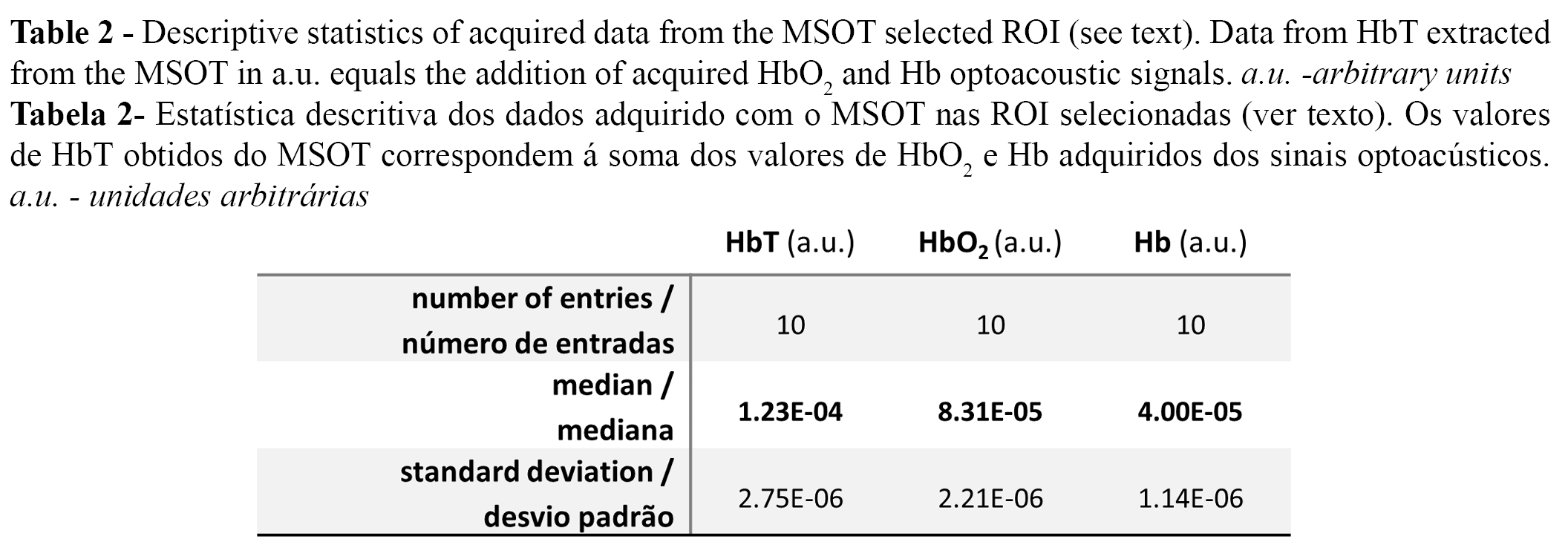 Through the MSOTview each scanned ROI exported data is provided in bursts of ten images derived from optoacoustic reconstruction. ROI selection of MSOT acquired images allows calculation of ROI volume (mm3), as well as the concentrations of HbO2 (in arbitrary units a.u.), oxidized Hb (a.u.) and melanin (a.u.) (4,14,18,20).