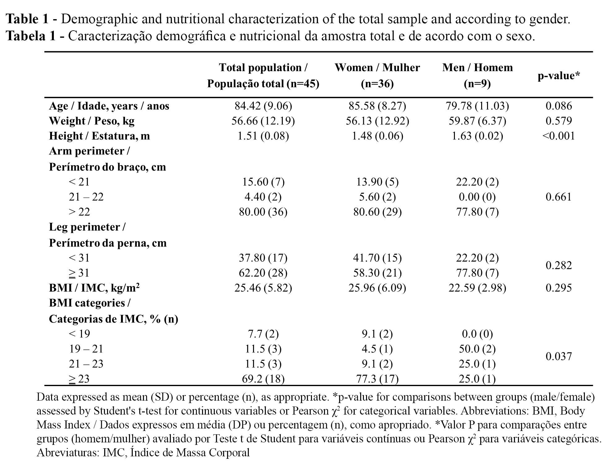 Forty-five participants (36 women and 9 men) with a mean age of 84 years (SD: 9 years) participated in the present analysis. The demographic and nutritional characteristics of the population (total and by gender) are shown in Table 1.