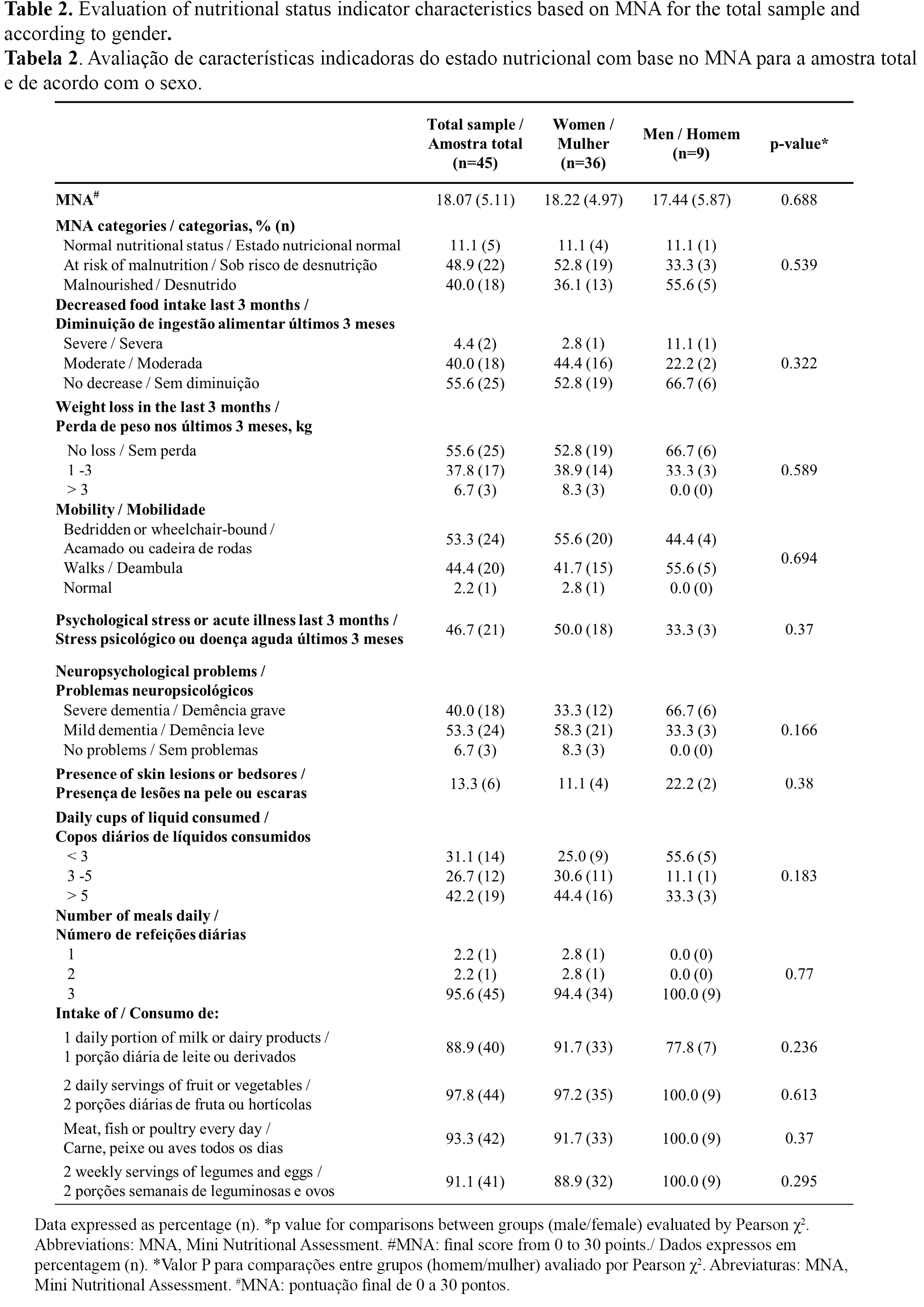 Table 2 shows the assessment of indicator characteristics of nutritional status based on the MNA for the total sample and according to the gender of the participants. No significant differences were observed in any of the parameters previously analyzed. Also, no statistical differences were observed regarding the final MNA score or its categories in the distribution by gender.