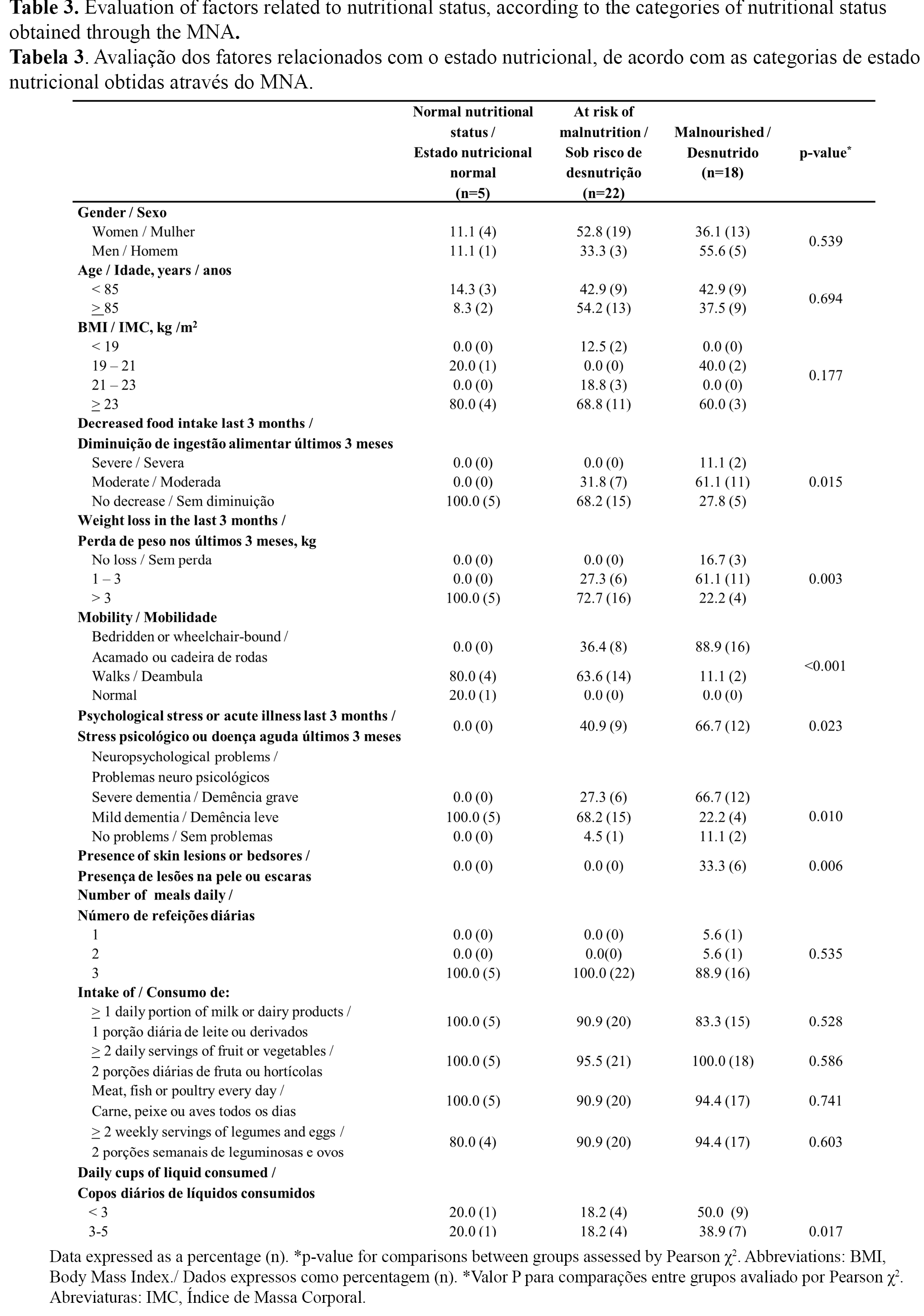 During the ageing process, there is a decrease in both balance and functional mobility, and immobility is one of the factors associated with decreased oral intake (20,21). Our results can be partially explained by this statement, as we observed that only the elderly with adequate nutritional status had normal mobility. In addition, the presence of psychological stress was observed only in the elderly at risk of malnutrition and in the malnourished elderly. It is known that a high incidence of neuropsychological problems can interfere with autonomy and social or professional performance in elderly individuals (22). In this study, malnutrition was associated with severe dementia, a situation also reported in other studies (23,24). On the other hand, the presence of skin lesions or bedsores was only observed in the malnourished elderly. Previously published studies have likewise indicated the existence of associations between malnutrition and the development of pressure ulcers and consequently the difficulty of their healing (21).