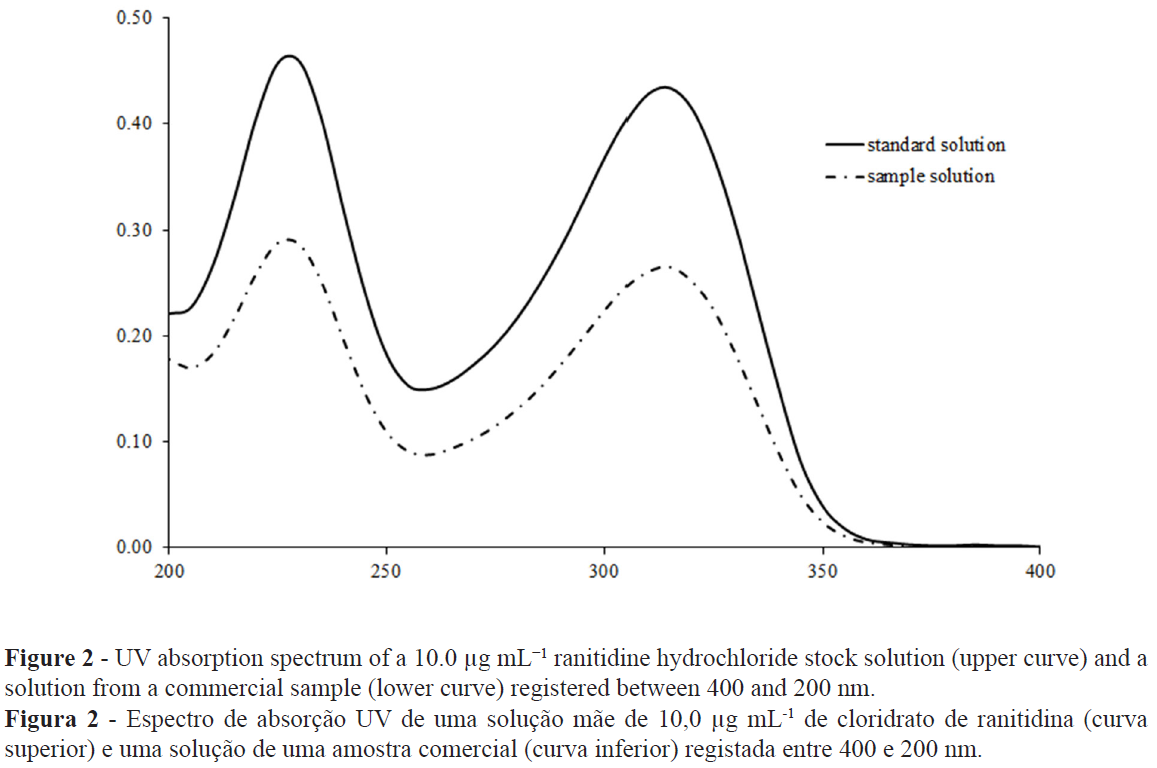 Figure 2 - UV absorption spectrum of a 10.0 µg mL−1 ranitidine hydrochloride stock solution (upper curve) and a solution from a commercial sample (lower curve) registered between 400 and 200 nm.