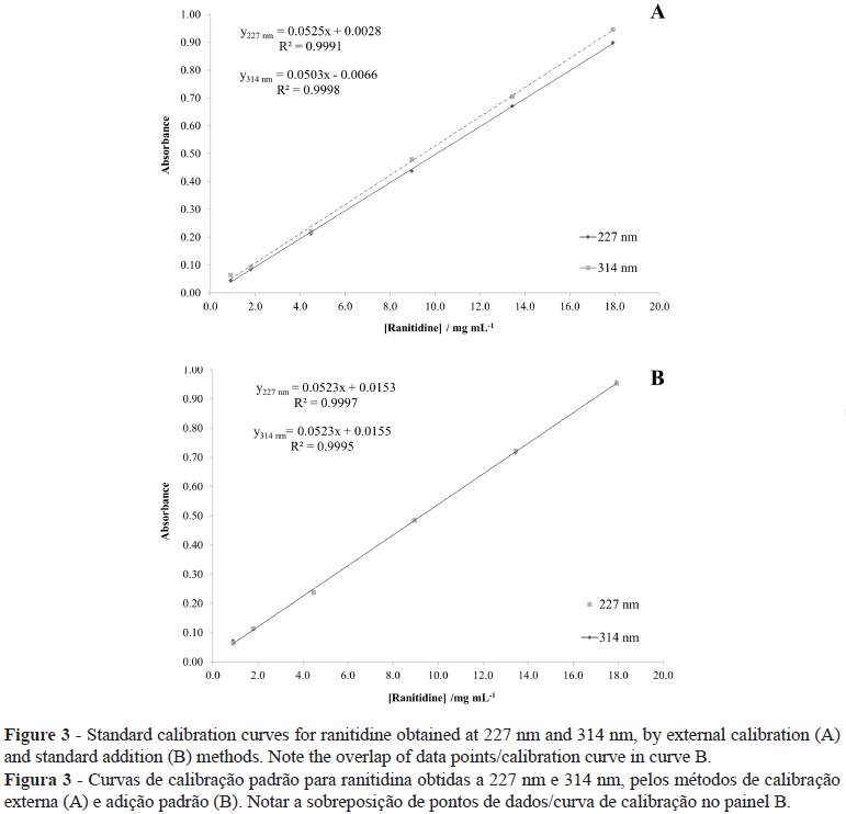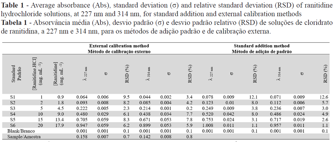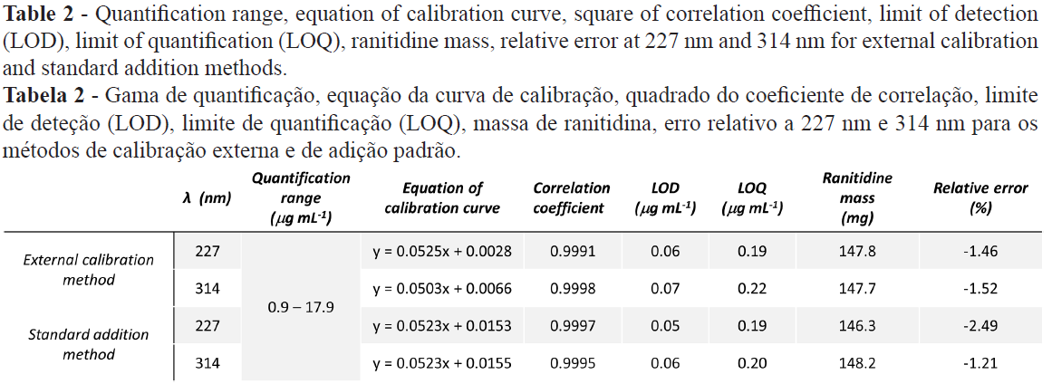 Table 2 - Quantification range, equation of calibration curve, square of correlation coefficient, limit of detection (LOD), limit of quantification (LOQ), ranitidine mass, relative error at 227 nm and 314 nm for external calibration and standard addition methods.