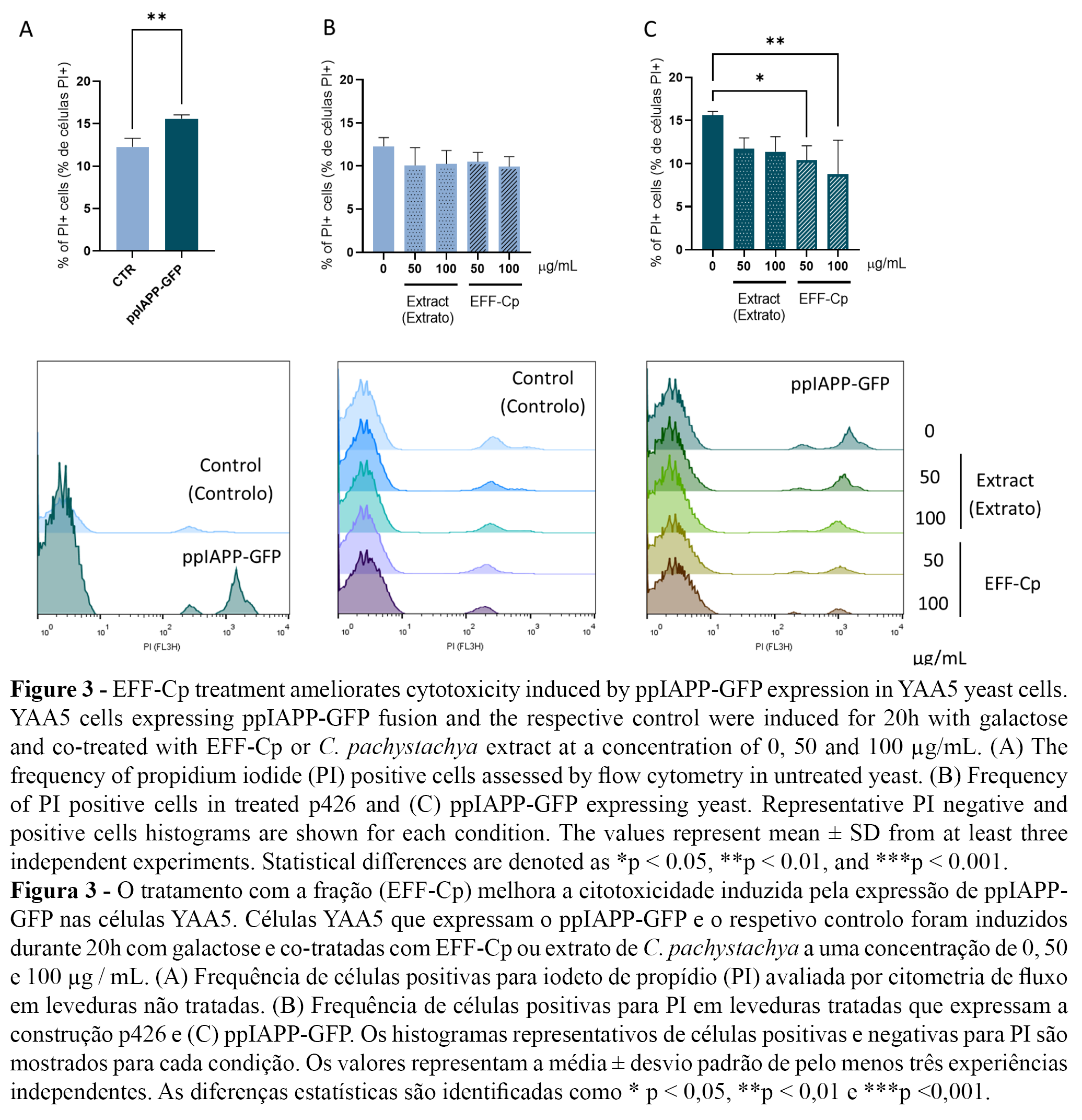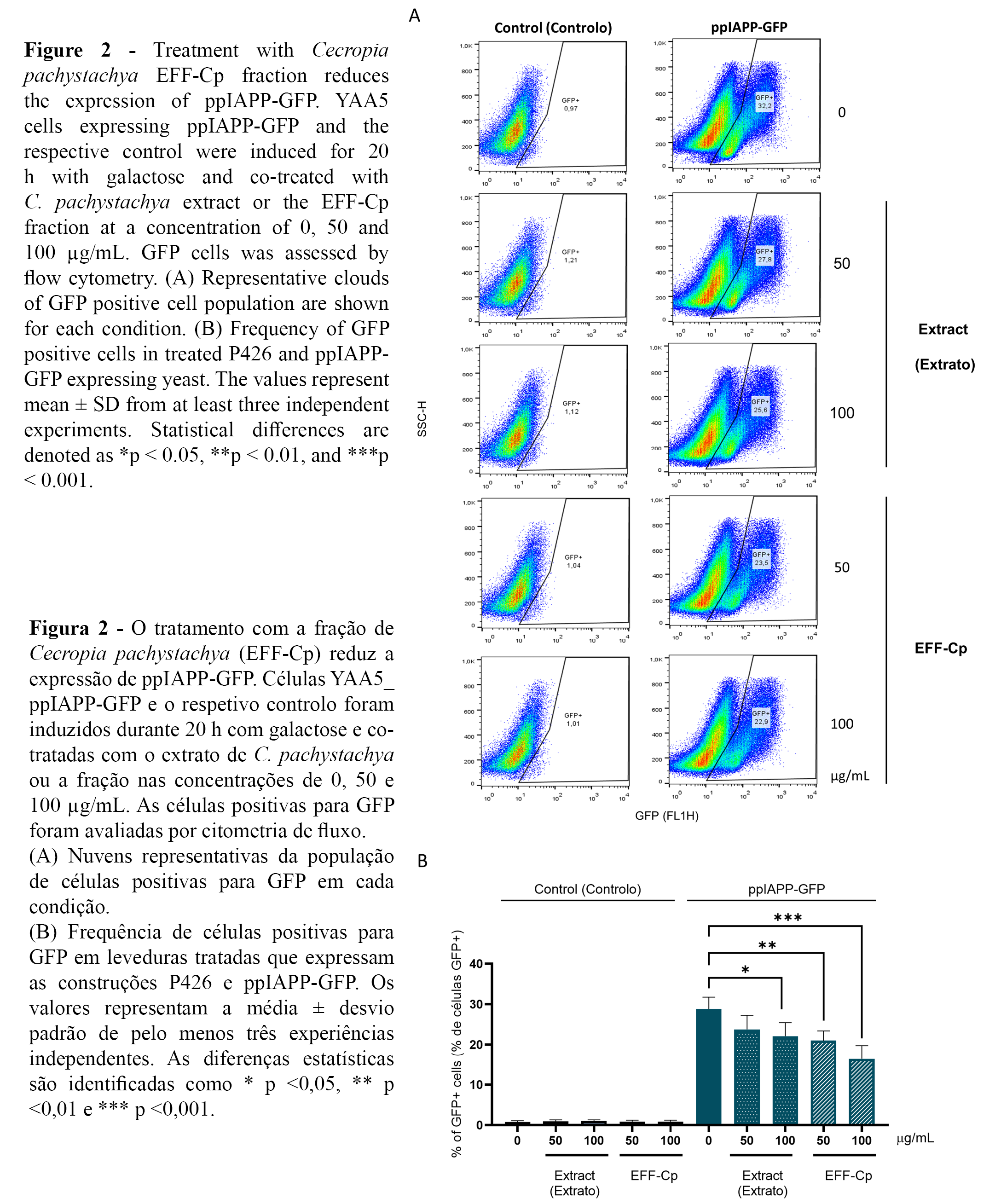 The reporter strain YAA5_ppIAPP-GFP was used to investigate further the potential protective action of C. pachystachya towards IAPP-induced cytotoxicity. ppIAPP-GFP expression was confirmed by flow cytometry, showing that nearly 30% of the total cell population displayed GFP signals in the control condition (Figure 2A, 2B). Interestingly, incubation with EFF-Cp induced a dose-dependent reduction in the percentage of GFP positive cell population in ppIAPP-GFP expressing yeast. However, further studies are needed to fully address the impact of EFF-Cp treatment on the expression ppIAPP-GFP fusion peptide.