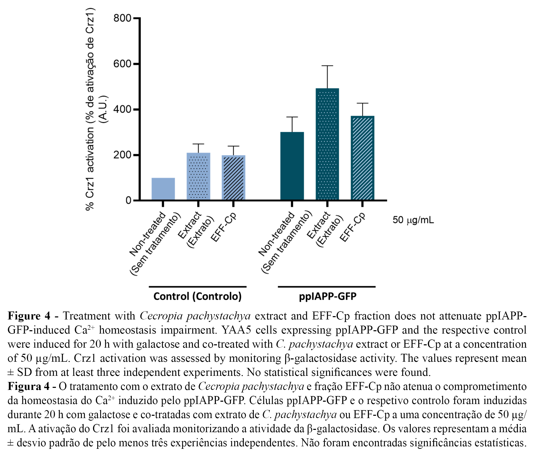 Taking advantage of the developed yeast-based reporter assay, we used YAA5 cells expressing control and ppIAPP-GFP constructs as “in vivo test-tubes” to screen the bioactivity of C. pachystachya extract and EFF-Cp towards the modulation of Ca2+ signalling and consequent Crz1 activation. Since treatment with the lower concentration (50 µg/mL) of EFF-Cp significantly protected cells against ppIAPP-GFP toxicity, we selected this concentration for further tests. The incubation of YAA5_ppIAPP-GFP cells with C. pachystachya extract did not affect β-galactosidase activity (Figure 4), which is in accordance with its ineffectiveness to protect cells against ppIAPP-GFP-induced toxicity in the viability assay. Similarly, in ppIAPP-GFP expressing cells, no alterations on Crz1 activation were observed after treatment with EFF-Cp. Since EFF-Cp is not able to inhibit Crz1 hyperactivation, we hypothesize that it might be conferring protection against deleterious effects of ppIAPP by modulating alternative molecular mechanisms that do not include CaM/CaN pathway. Additional studies are needed to fully comprehend the molecular and cellular mode of action underlying EFF-Cp protective effect.