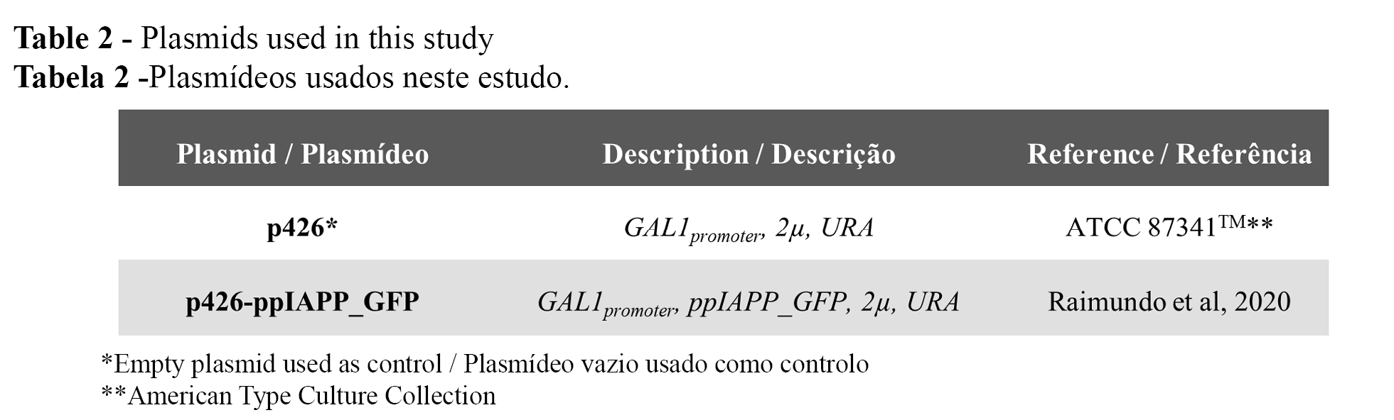 Synthetic dropout (SD)-2% glucose medium was used for the growth of cells transformed with the plasmids of interest. A pre-inoculum was prepared in SD-raffinose medium, and cultures were incubated overnight at 30°C under orbital shaking. Cultures were diluted in fresh medium and incubated under the same conditions until the optical density at 600 nm (OD600) reached log growth phase. The following equation was used to synchronize the cultures: ODi × Vi = ODf / [2(t/gt)] × Vf, where ODi is the initial optical density of the culture, Vi is the initial volume of culture, ODf is the final optical density of the culture, t is the time, gt is the generation time of the strain, and Vf is the final volume of culture. Cell cultures were diluted as indicated for each assay. In all experiments, induction of IAPP expression was carried out in SD-galactose medium. Media composition is detailed in Raimundo et al. (2020) (23).