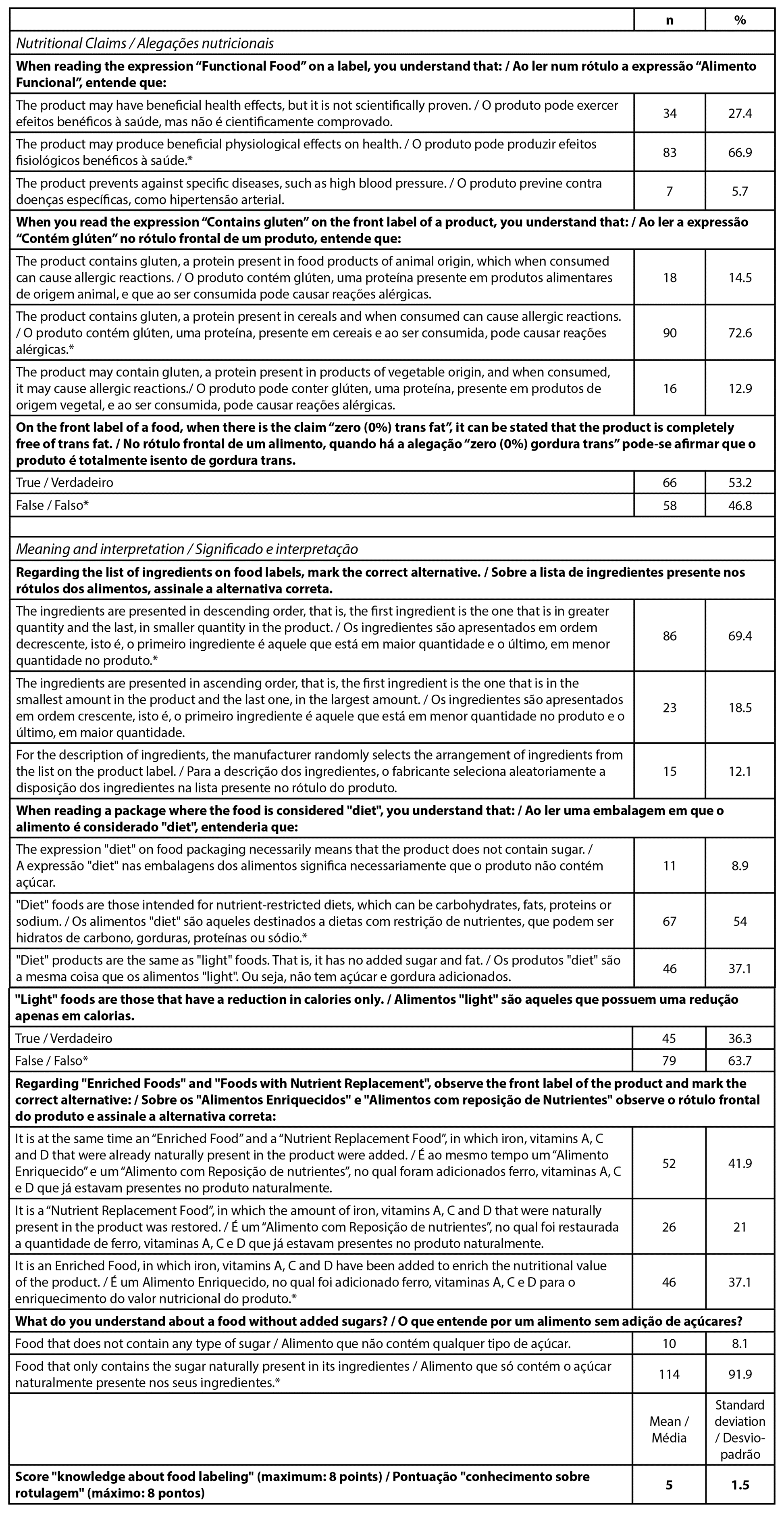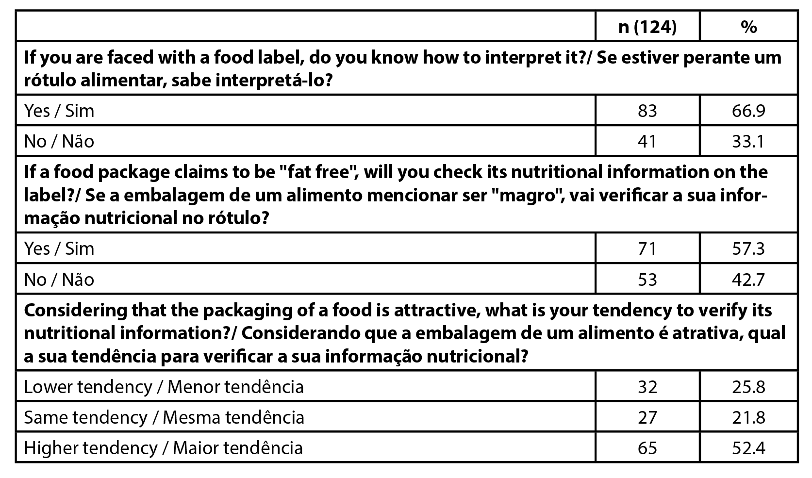 Table 2 - Assessment of knowledge about food labeling (n=124). Answers considered correct according to Morais et al. (9) are indicated with an asterisk (*). |
